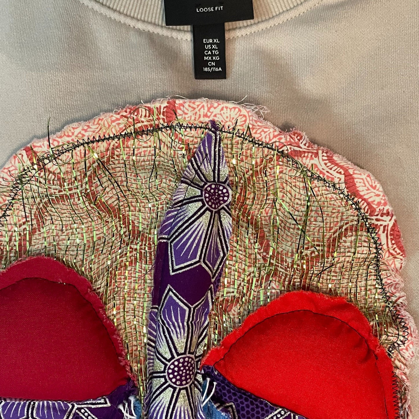 Inspired by my grandmother’s sewing lessons and the textile waste that too often washes up on African shores, these sweatshirts are both artistic statement and environmental resistance.